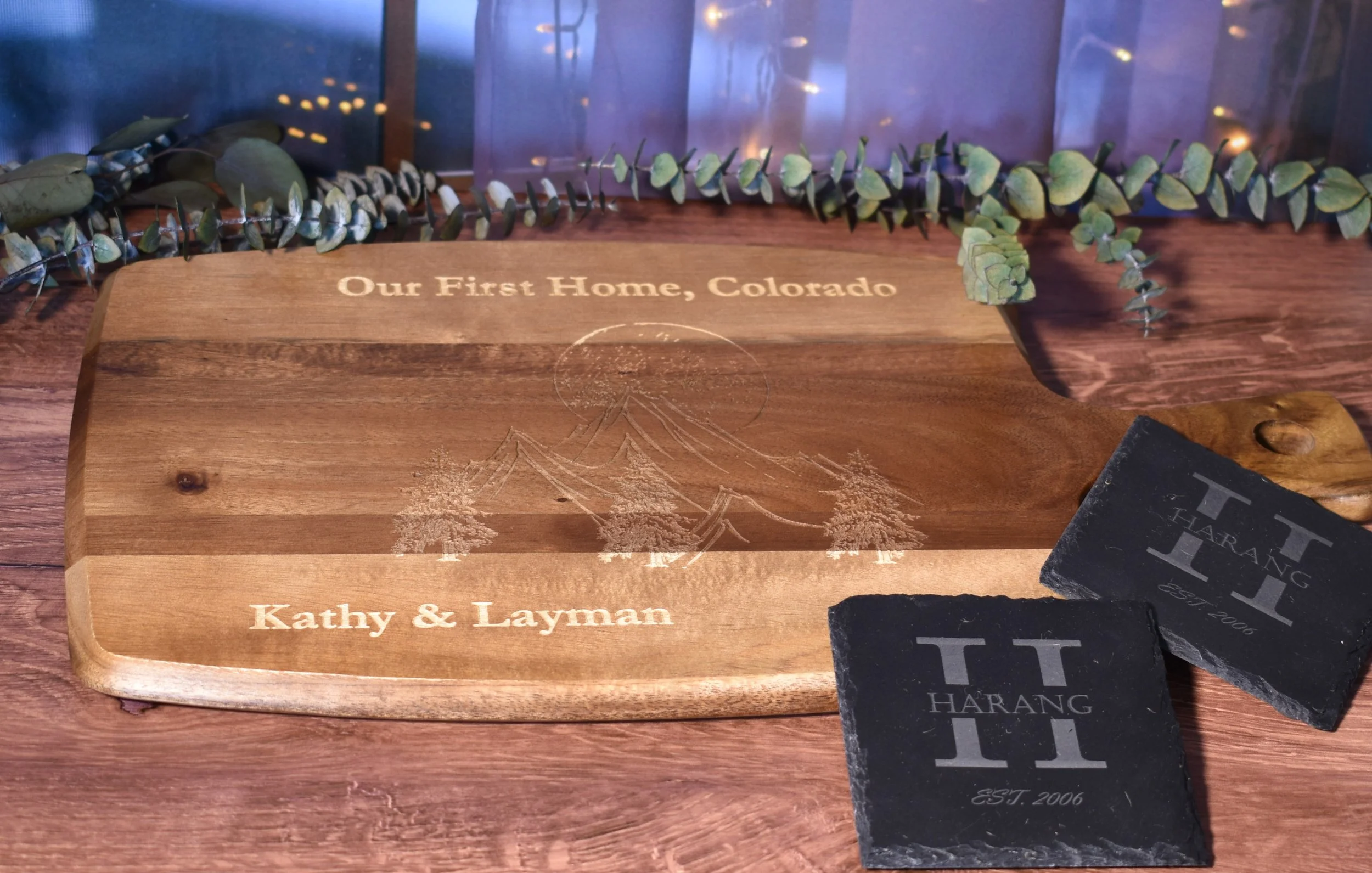 Charcuterie & Cheese BoardsHandcrafted from American Hardwoods and certain Exotics in our Loveland, Colorado wood shop.See our current selection below. The Mountains $134.00 Engraved Wood & Slate Cheese Board $53.00 The Colorado Logo & Mountains $134.00 The Rockies $134.00 Engraved Wood Cheese Board $53.00 Wyoming & Cowboy $134.00 Engraved Charcuterie Board $134.00